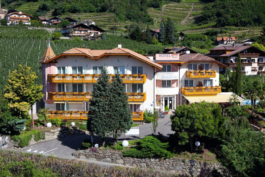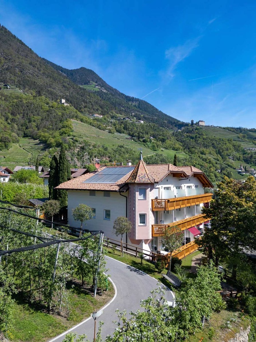 The stunning view of Merano and the Adige Valley, the quiet setting amidst orchards and vineyards in the countryside and the warm sun of the mountains offer a uniquely romantic, yet informal, 'alpine experience'. The heated swimming pool, the Finnish blockhouse sauna and the splendid gardenare the perfect location for a relaxing stay.